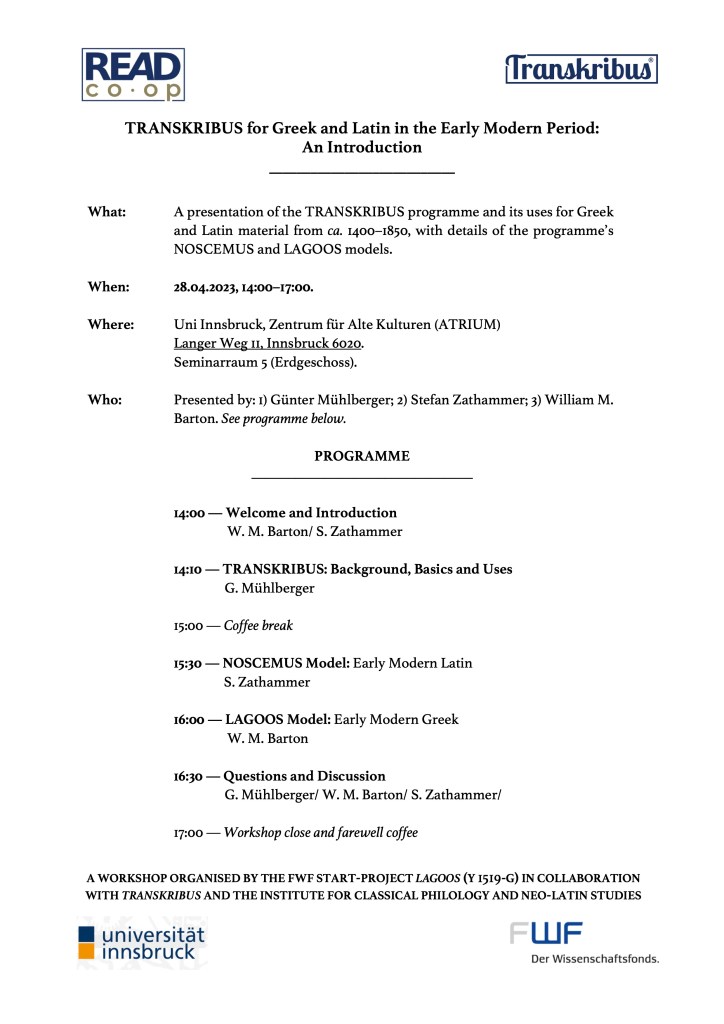 On Friday 28th April 2023, the LAGOOS project is organising a workshop on the Transkribus handwritten text recognition software for Latin and Greek texts of the early modern period (1400–1850).