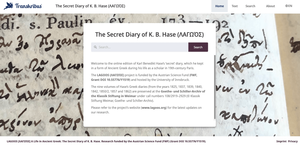 Alongside the project’s analysis of Hase’s work as a scholar and his biography, the LAGOOS team has as a principle aim the digital presentation of the nine surviving years of the original diary text. After preparatory work over the last months, the website for the online presentation of the text is now ready: https://app.transkribus.org/sites/lagoos