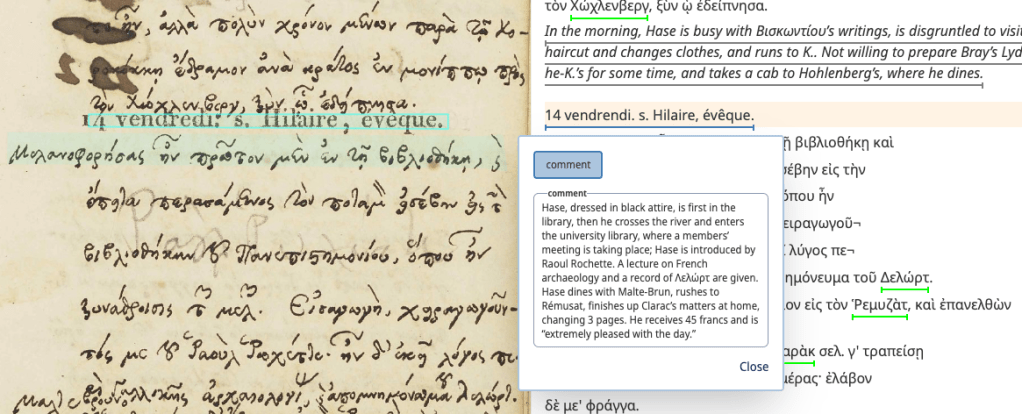 The edition presents the image of the original manuscript, with a facing transcription. Certain elements of the Greek text are marked as “tagged” by being underlined. If the reader clicks on these tagged elements, they can access information about the person, place, publication, event, language etc. recorded by the LAGOOS team in the course of their research. Beneath the Greek text, there then follows the English regestum for each day. These regesta can also be accessed by clicking on the tagged date line (in printed French) of the diary, which opens a comment both with the English text.