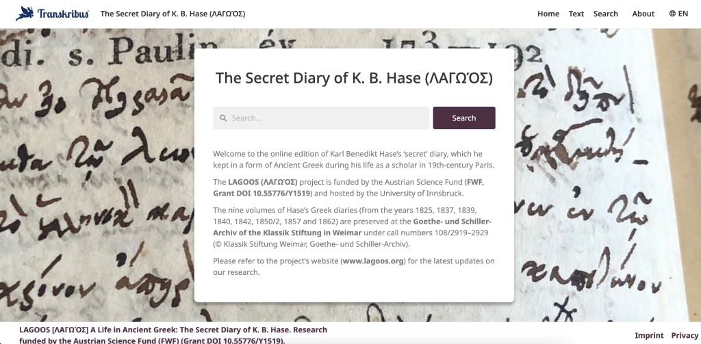 Following an interview with Eva Fessler from the journal’s editorial team, the article reports in particular on the project’s latest article, which appeared open-access in Byzantine and Modern Greek Studies in February: “Learning Modern Greek in nineteenth-century Paris: K. B. Hase’s student notes”. The article also introduces the first volume of our ongoing online presentation of Hase’s diaries, available on our edition website: https://app.transkribus.org/sites/lagoos.