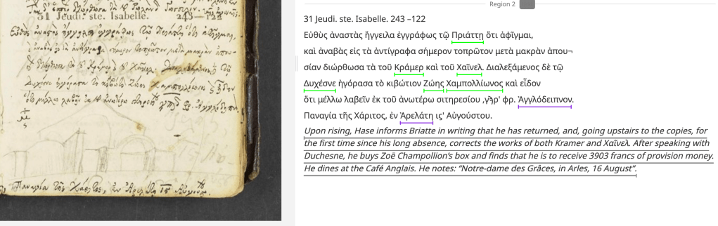 The edition presents the image of the original manuscript, with a facing transcription. Certain elements of the Greek text are marked as “tagged” by being underlined. If the reader clicks on these tagged elements, they can access information about the person, place, publication, event, language etc. recorded by the LAGOOS team in the course of their research. Beneath the Greek text, there then follows the English regestum for each day.