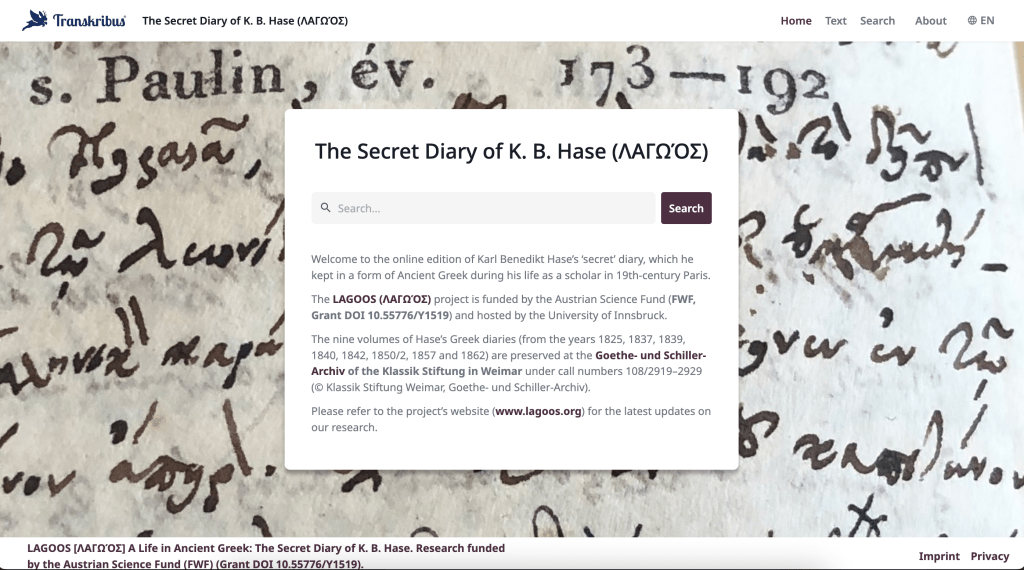 Following one of the team’s now traditional “Edit-a-thons” in Innsbruck today, the digital edition of the year 1839 from Hase’s diary has been uploaded to the publication website: https://app.transkribus.org/sites/lagoos. This is the third diary volume (of nine) published by the ΛΑΓΩΟΣ project.
